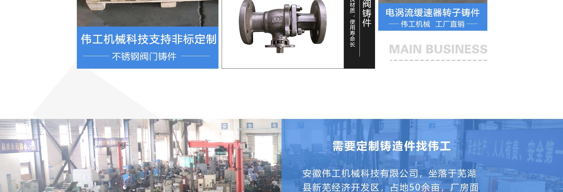 安徽偉工機(jī)械科技有限公司,坐落于安徽蕪湖新蕪經(jīng)濟(jì)開發(fā)區(qū),是一家専業(yè)從事鑄造產(chǎn)品設(shè)計(jì)、研發(fā)、生產(chǎn)、銷售于一體的企業(yè),公司為客戶的產(chǎn)品提供多樣的技術(shù)支持與設(shè)計(jì),公司主要鑄造技術(shù)有潮模砂鑄造、硅溶膠精鑄工藝。主要產(chǎn)品有:不銹鋼閥門配件、泵閥配件、汽車配件、工業(yè)管道配件、工程機(jī)械配件、汽車配件等。材質(zhì)為:低合金鋼、304、316、316L、鉻鉬鋼、哈氏合金、碳鋼、雙相鋼等。公司已先后通過ISO9001和TS16949等多種體系審核,以完備的管理手段和齊全的檢測(cè)設(shè)備滿足客戶需求,進(jìn)的設(shè)備,専業(yè)的技術(shù),嚴(yán)謹(jǐn)?shù)墓芾恚€(wěn)定的質(zhì)量。服務(wù)客戶,鑄造未來,偉工誠(chéng)摯的歡迎新老客戶共同商洽合作